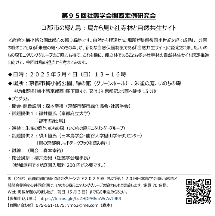 関西定例研究会のお知らせ 緑化協会、鳥学会員近畿地区例会との共催で関西定例研究会を実施します。 ご参加をお待ちしております。